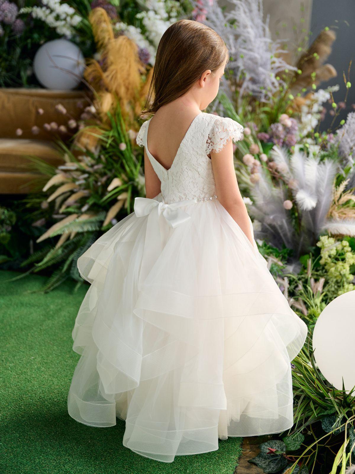 Make your little one the star of the show in this breathtaking Teter Warm Couture Off White Lace Wedding Flower Girl Dress. Crafted with a lace bodice, cap sleeves, and a tiered horsehair bottom, this dress is the epitome of elegant sophistication. The included silver crystal belt add-on and mesh and net skirt take the look to the next level, ensuring your flower girl shines brighter than the sun. This dress is designed to make your flower girl feel like a true princess on the wedding day. With its timeless style and luxurious details, she'll radiate confidence and beauty as she leads the way down the aisle.