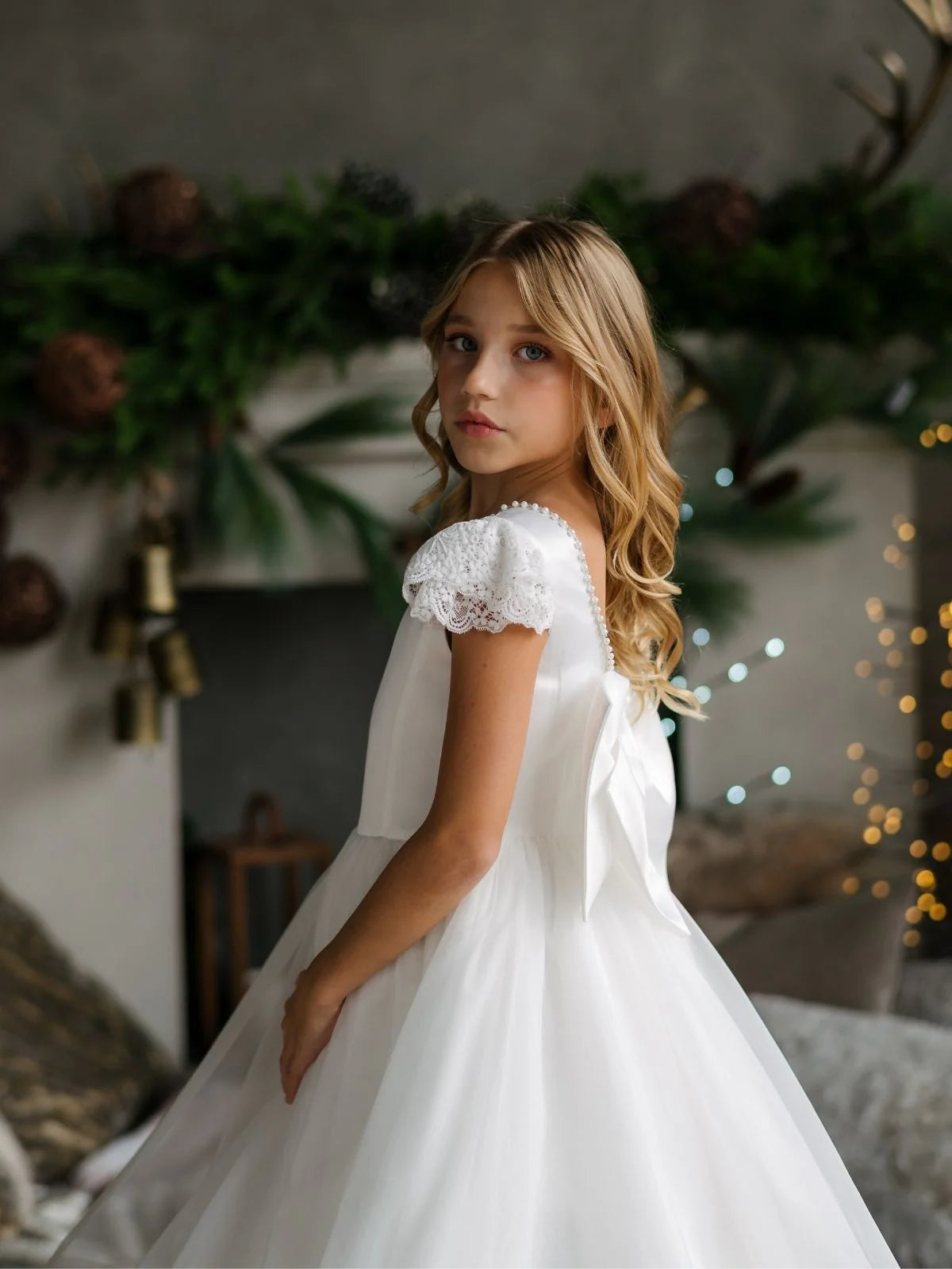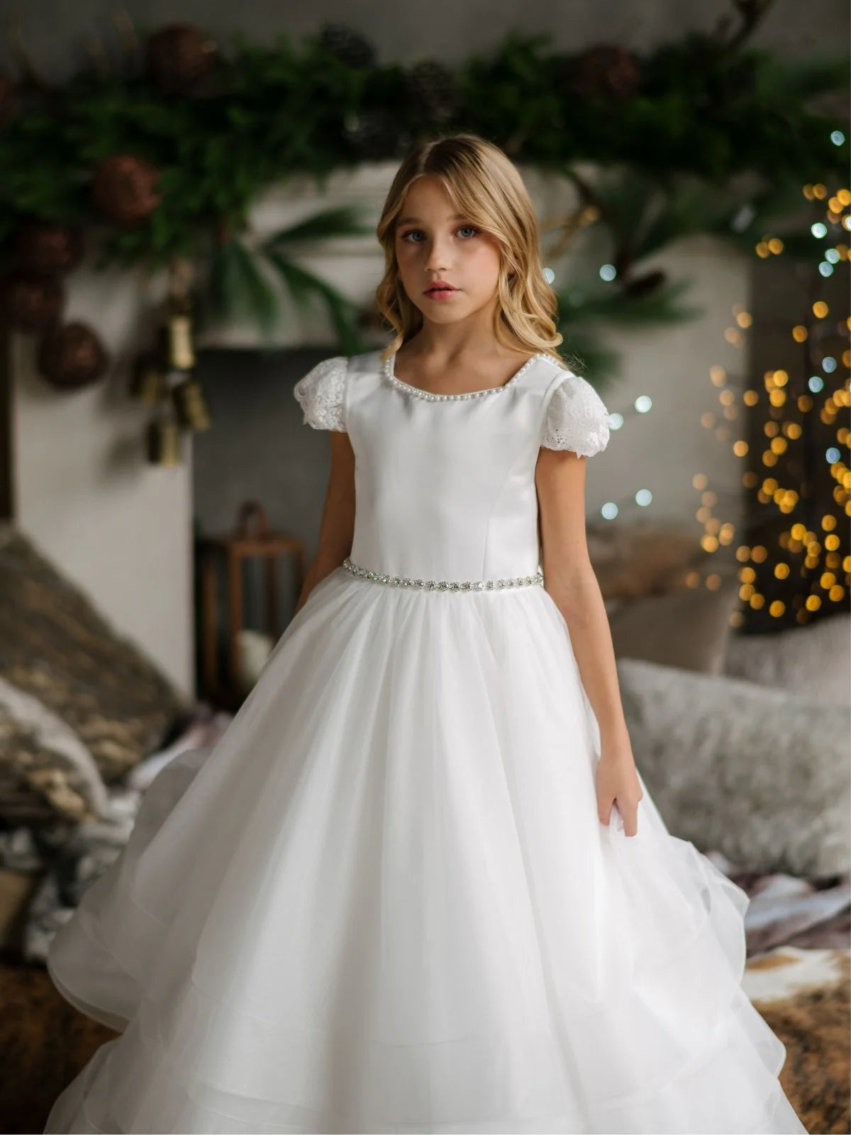 The Teter Warm Couture Off-White Tulle Communion Dress is a stunning choice for your little one's First Communion. Designed with a round-square neckline and adorned with pearl lining from the neckline to the back, this dress exudes elegance and grace. The layered lace cap sleeves add a touch of vintage charm, while the satin bodice offers a smooth, luxurious feel. The tiered horsehair tulle bottom provides volume and movement, creating a dreamy silhouette. For added sophistication, the dress features a detachable bow at the waist, perfect for personalization. Complete with a back zip closure, this dress ensures a comfortable and secure fit for your child on her special day.