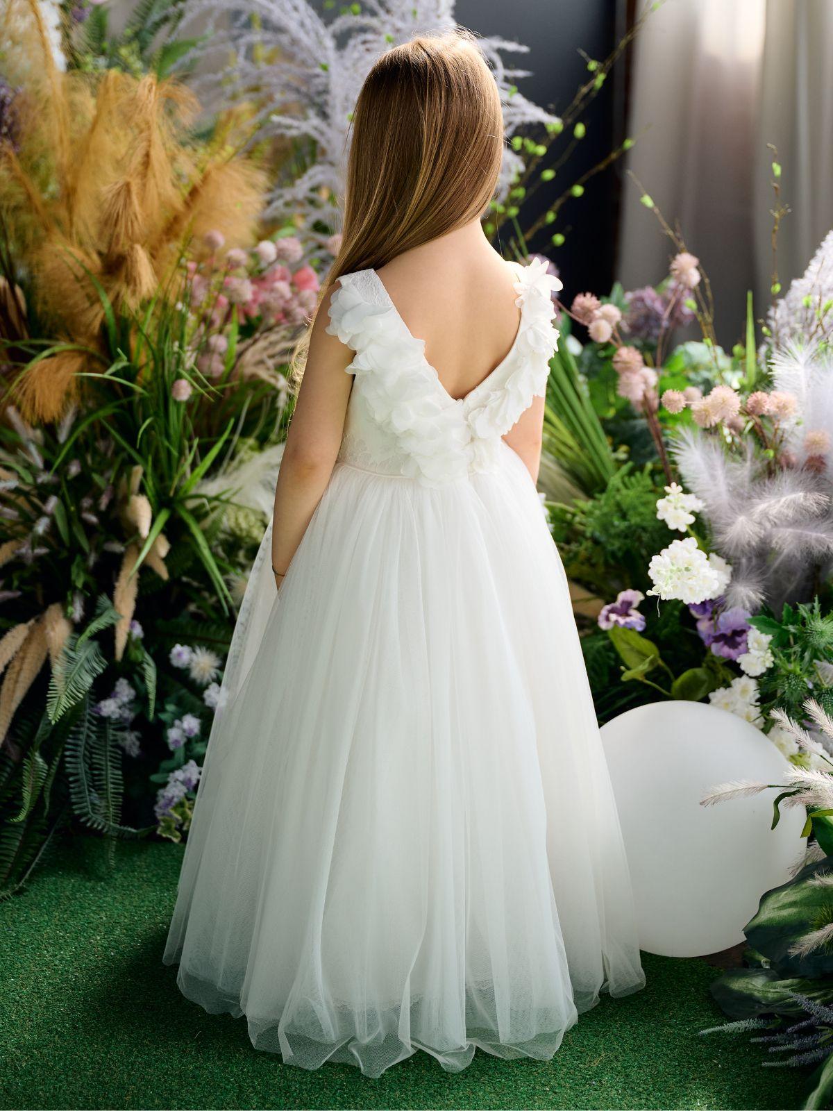 The Teter Warm Couture Special Occasion Flower Girl Lace Tulle Dress - is the perfect dress for your little princess's special day! This exquisite dress features an elegant off-white color, round neckline, and sleeveless design for a timeless look. The back zip closure ensures a secure and comfortable fit, while the lace overlay bodice adds a touch of sophistication. The 3D floral V-Back detail adds a touch of whimsy and charm, making this dress truly unique.