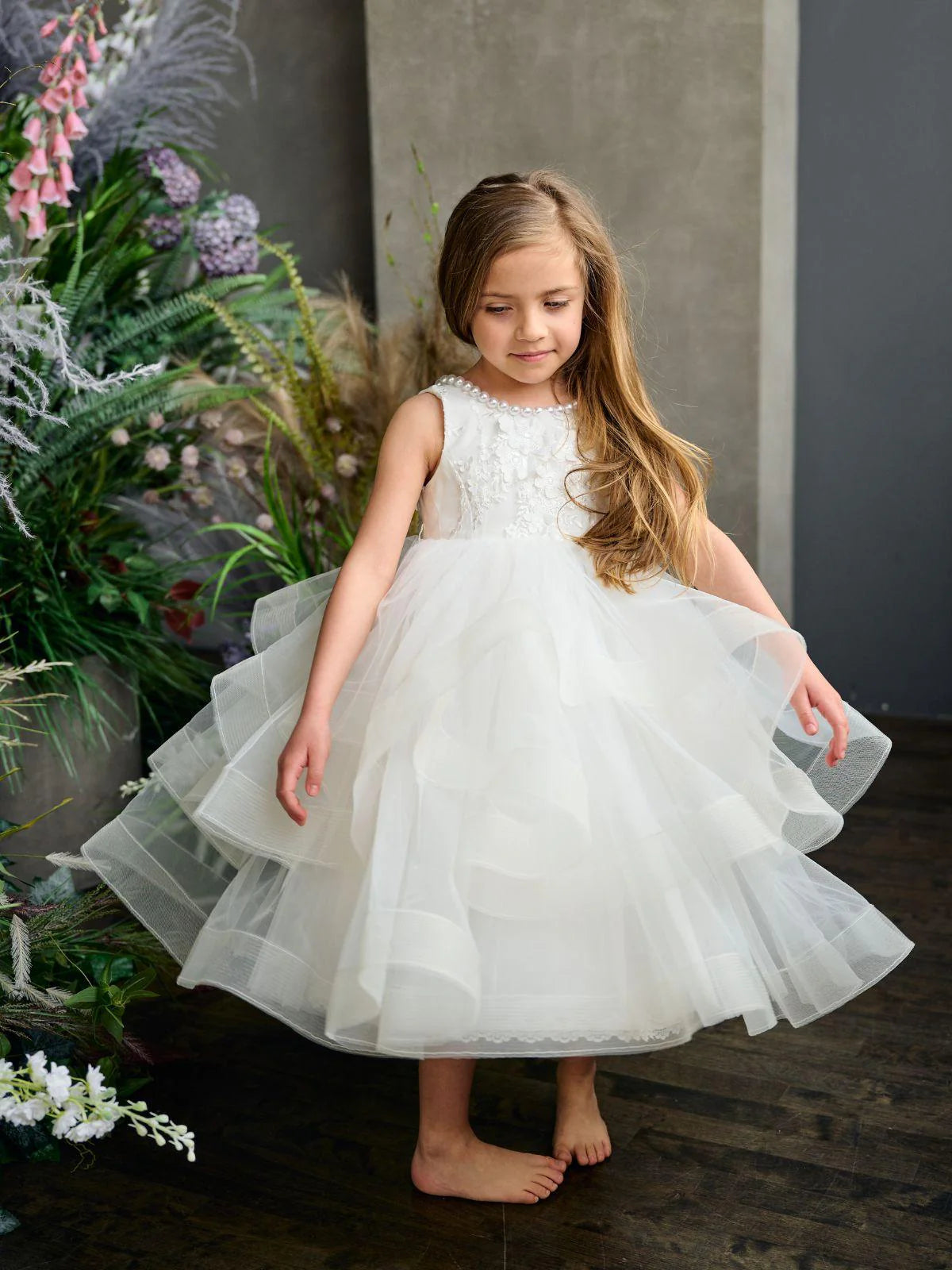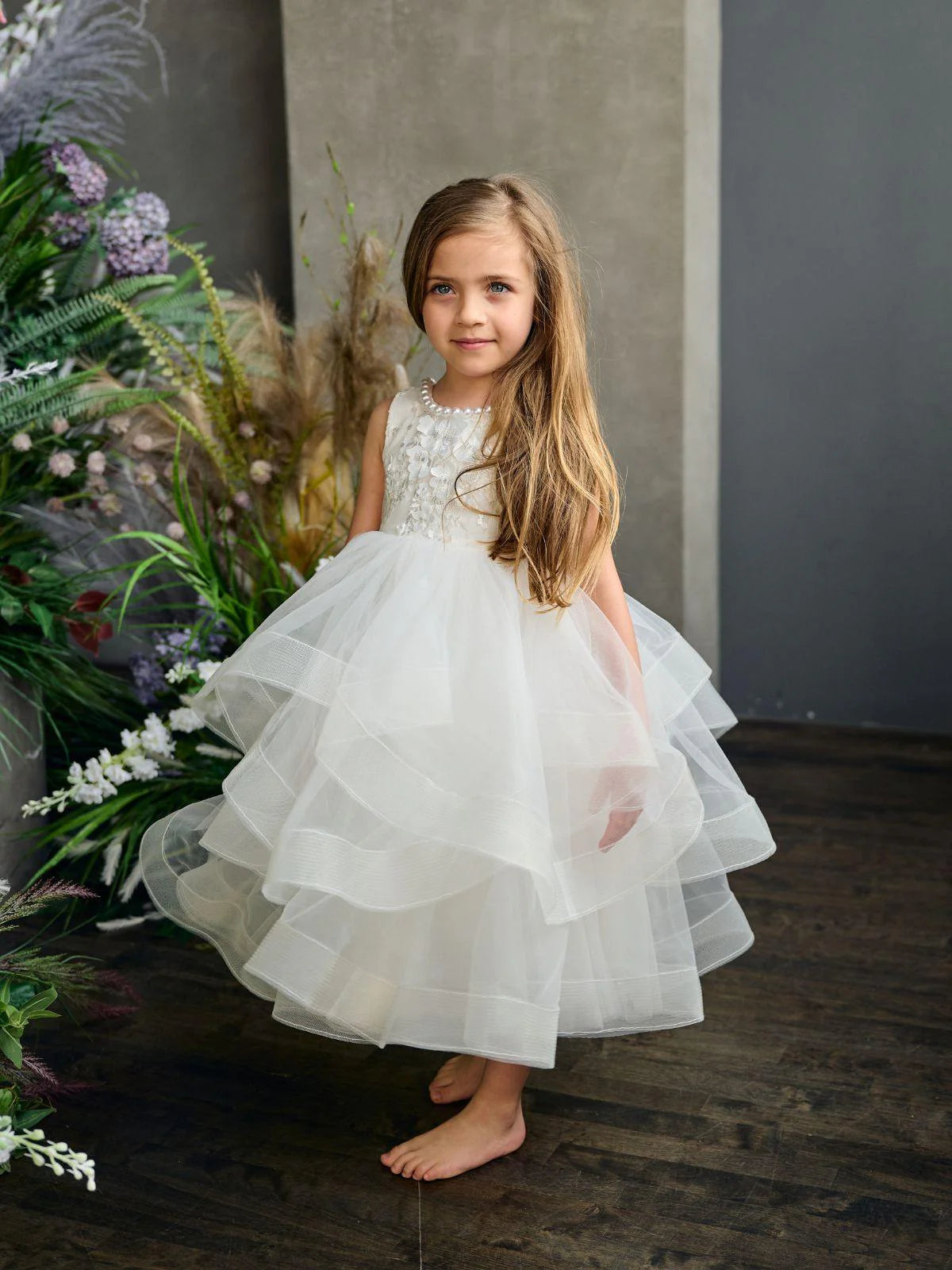 Captivate onlookers with the Teter Warm Couture Lace Tulle Flower Girl Dress. This exquisite gown is crafted with an eye-catching 3D lace bodice, pearl lining V-Back, and a flowing tiered horsehair skirt. Elevate the look further with the included silver crystal belt add-on. The Teter Warm Couture dress is the perfect choice for weddings, formal parties, and any special occasion where your little one deserves to shine. Its high-end construction and regal silhouette will make your flower girl the center of attention. Pair with the crystal belt for an extra touch of glamor.