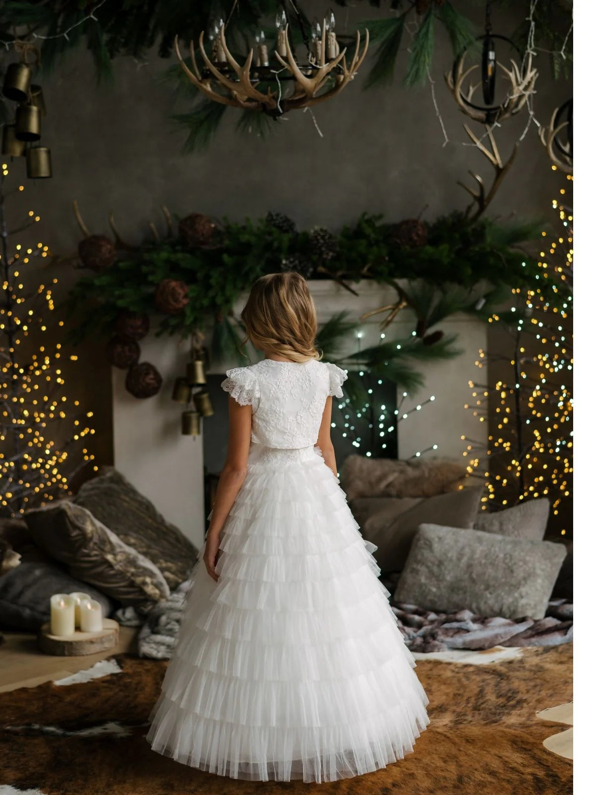 Transform your little one into a vision of elegance with this white tiered tulle dress, complete with a matching lace bolero jacket. Featuring a delicately designed lace bodice, flutter sleeves, and a layered tulle skirt, this ensemble is perfect for weddings, holiday celebrations, and photoshoots. The lace bolero adds a touch of sophistication and versatility, making it a timeless choice for any special occasion.