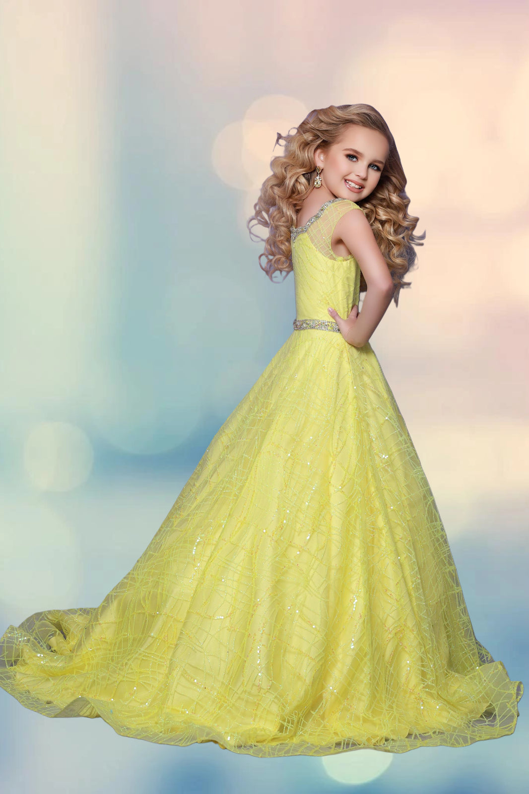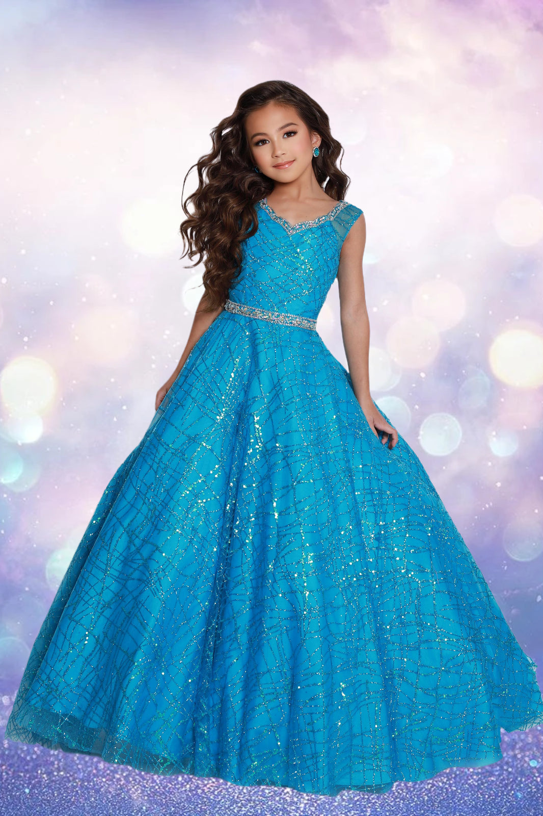 Turn heads in the sparkling Janiyah gown, a breathtaking turquoise pageant dress designed to captivate. The full-length glitter tulle skirt shimmers with every movement, while the intricate lattice sequin overlay adds dimension and glamour. A beaded waistline highlights the silhouette, and the V-back with delicate shoulder straps makes it ideal for portraits, stage moments, or formal celebrations. Also available in sunshine yellow for a bold, radiant look.