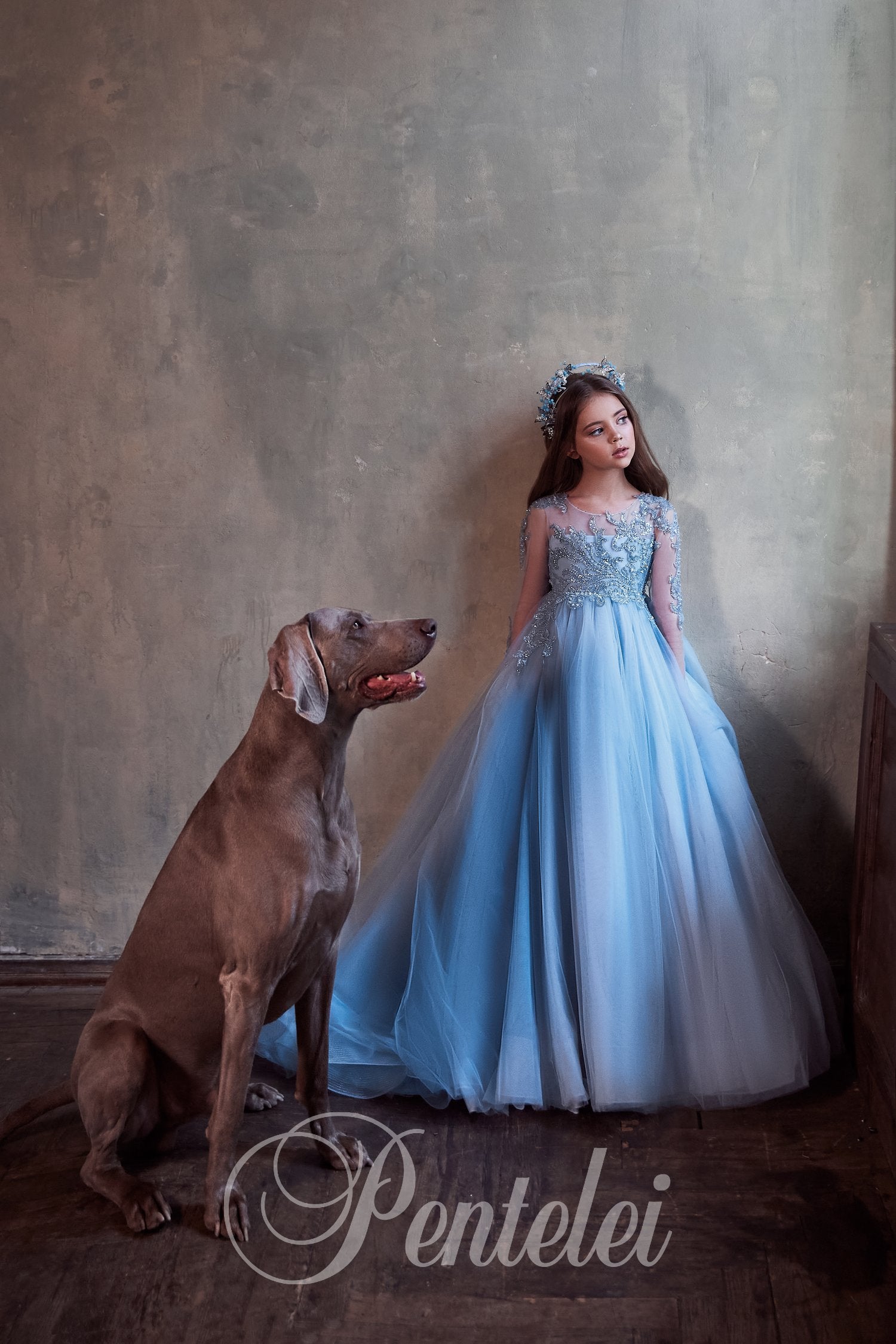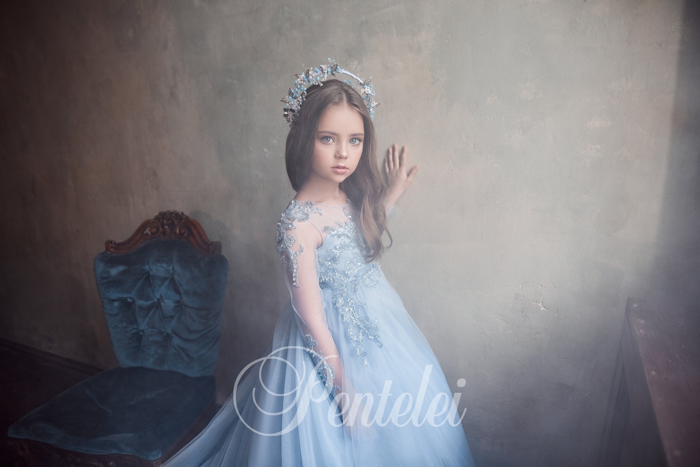 Make her special moment unforgettable in the Valencia gown by Pentelei Couture. This breathtaking icy blue ball gown stuns with its floor-sweeping tulle train and elaborately hand-beaded bodice. Elegant illusion sleeves are adorned with shimmering sequin embroidery, while the flowing full skirt glides effortlessly with every step. A true couture masterpiece, the Valencia gown is designed for flower girl moments, first communions, and the most memorable of special occasions. Custom-made to perfection for a flawless fit and timeless elegance.