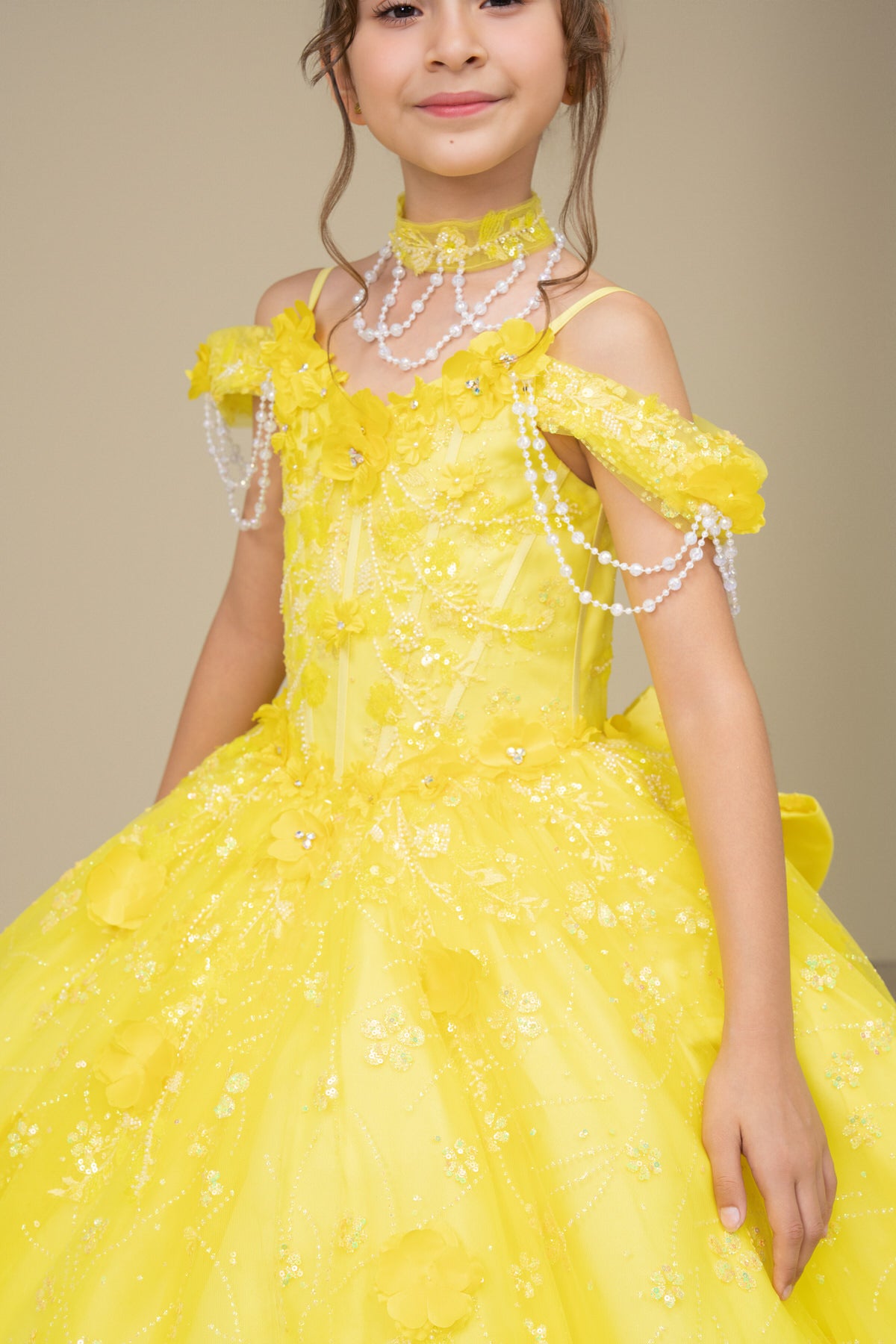 Bright, bold, and absolutely unforgettable, the Marigold Bloom Ballgown is designed for girls who love to shine. This stunning floor-length girls pageant dress features a radiant yellow glitter tulle skirt adorned with delicate floral appliqué and shimmering sequin embroidery that sparkles beautifully under stage lights. The structured bodice showcases intricate detailing with soft 3D flowers and elegant off-shoulder straps draped with pearl accents for a true princess-inspired look. A lace-up corset back ensures an adjustable, secure fit, while the dramatic oversized bow and flowing sweep train create a grand entrance from every angle. Perfect for pageants, birthday celebrations, daddy-daughter dances, holiday portraits, and formal special occasions, this gown offers statement style at a medium-end price point—luxurious in appearance yet accessible for families who want elegance without couture pricing. Available in vibrant Yellow, soft Lilac, and sweet Pink, this gown delivers color, sparkle, and confidence in every twirl.